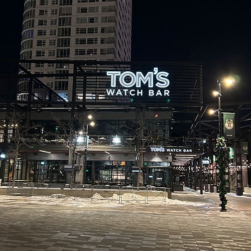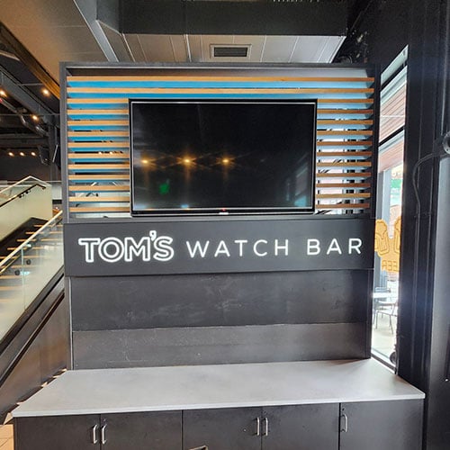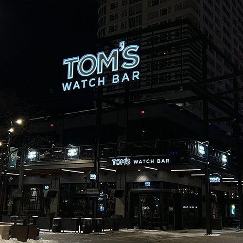 This project involves the rebranding of the old Mecca Bar in Milwaukee's downtown Deer District, which Lemberg originally fabricated and installed in 2018. After a change in ownership, Lemberg was contacted to provide brand signage for the new Tom's Watch Bar. Leveraging our previous experience with the location, Lemberg designed, built, and installed five new signs to fit Tom's clean brand design.