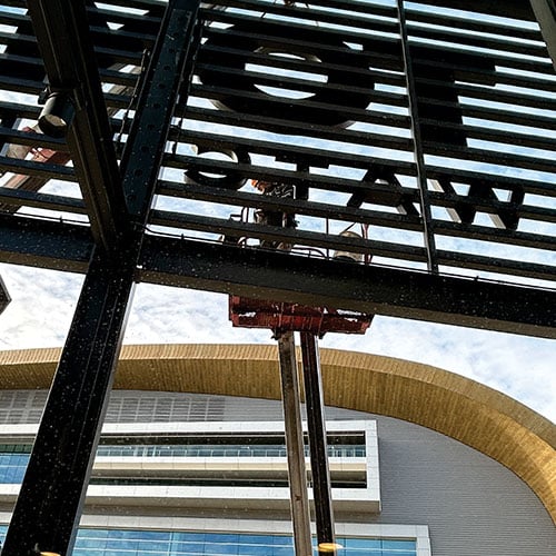 The main brand signage creates an impressive visual presence at 11'x24'. To achieve the neon appearance with the large channel letters, the team inserted one-inch acrylic through routed aluminum. Because the team had installed signage for the previous bar, they were familiar with the challenges presented by the building's open-tube architecture. A specially designed attachment was devised to allow the team to conceal all the electrical wiring within the existing tube structure.
